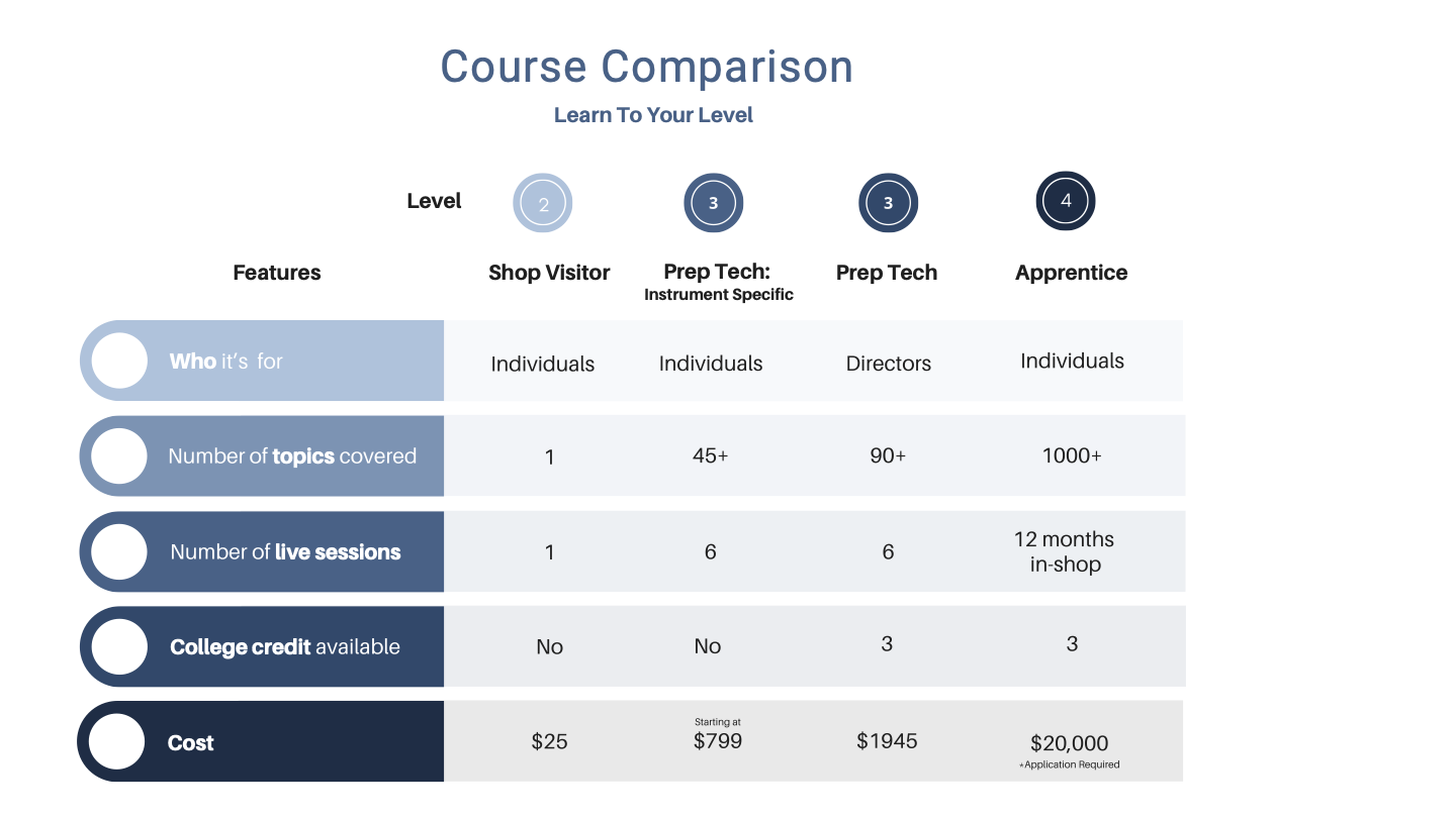 The Apprenticeship is for the individual who desires to become a career instrument repair technician. This is no small commitment, both financially or in time, but the rewarding nature of the program will pay dividends.